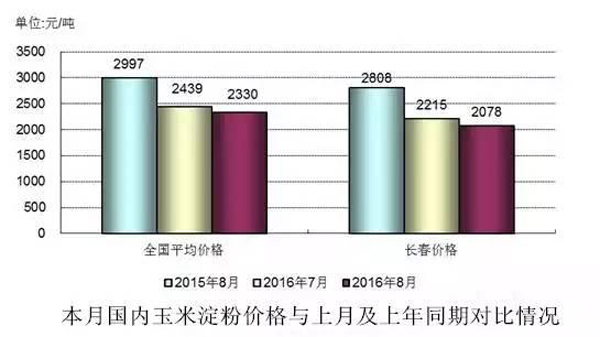 2016年7-8月份國內(nèi)淀粉價(jià)格先跌后漲,總體仍呈下跌趨勢。8月份全國淀粉平均價(jià)格為2330元/噸,環(huán)比下降108元/噸,降幅4.45%;同比下降667元/噸,降幅22.25%。其中,長春地區(qū)淀粉出廠價(jià)格為2078元/噸,環(huán)比下跌137元/噸,降幅6.18%;同比下降730元/噸,降幅25.99%。