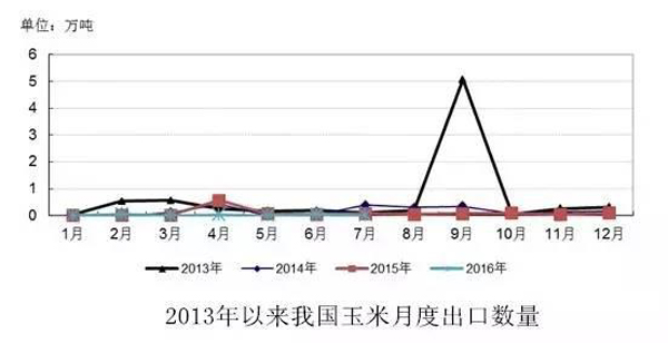 海關(guān)數(shù)據(jù)顯示,7月份我國玉米出口量為50噸,8月份出口420噸。2015/16年度以來累計(jì)出口0.38萬噸,同比下降66.55%。近年來國內(nèi)玉米出口維持下降趨勢。由于頭號出口大國美國玉米下一年度預(yù)計(jì)豐產(chǎn),且出口報(bào)價(jià)較低,2016/17年度我國玉米出口將非常有限。