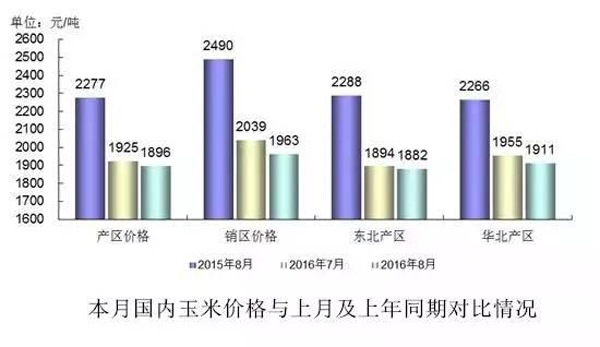 2016年8月份,我國玉米產(chǎn)區(qū)平均價(jià)格1896元/噸,比上月下降28元/噸,降幅1.48%;同比下降381元/噸,降幅16.73%。其中,東北產(chǎn)區(qū)價(jià)格為1882元/噸,環(huán)比下降12元/噸,降幅0.66%,同比下降407元/噸,降幅17.77%;華北黃淮產(chǎn)區(qū)價(jià)格為1911元/噸,環(huán)比下降44元/噸,降幅2.27%,同比下降355元/噸,降幅15.68%;國內(nèi)銷區(qū)玉米價(jià)格為1963元/噸,環(huán)比下降76元/噸,降幅3.75 %,同比下降527元/噸,降幅21.18%(圖)。