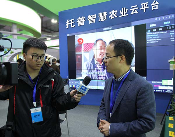 這一番“互聯網+農業”的介紹也獲得了浙江衛視的關注。記者來到托普云農展位,公司副總朱旭華向記者介紹了公司獲得的科研成就及展出的智能化軟硬件系統。主要有:托普云農農業“四情”監控系統、設施農業監控系統、水肥一體化監控系統、智慧農業云平臺等農業物聯網系統、平臺及土壤墑情監控系統硬件、農藥殘留速測儀、相關智能硬件設備(如遠程傳輸智能蟲情測報燈、溫室通、大田六合一無線傳感器、植物本體傳感器)。
