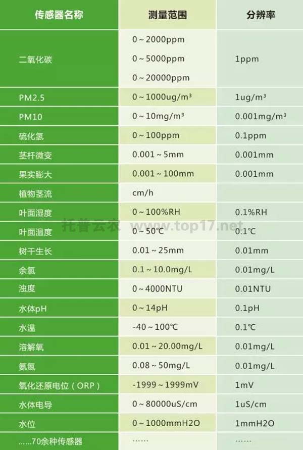 在農業氣象方面,目前有空氣溫度、濕度、光照強度、光合有效輻射、二氧化碳、雨量、蒸發、風速風向、大氣壓、總輻射、紫外輻射等傳感器。同時,還有應用于畜禽養殖監測的氨氣、硫化氫等傳感器,應用于水質監測的pH、余氯、濁度、溶解氧、氨氮、水溫等傳感器,應用于環境監測的一氧化碳、二氧化碳、甲醛、PM2.5、PM10等傳感器。