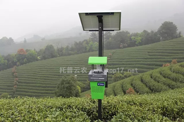 茶園專用殺蟲燈,可物理誘殺茶園主要害蟲,尤其是茶小綠葉蟬和鱗翅目尺蠖科害蟲,并最大限度避免對天敵昆蟲的誘殺,是托普云農和茶學專家陳宗懋院士團隊歷經三年精心研制。