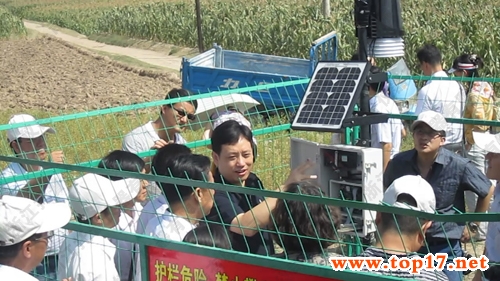 在示范區內,護欄內的固定式無線農業氣象綜合監測站吸引了高處長及各參會代表的注意。陳渝陽總經理詳細介紹了此系統的功能、用途,并現場簡單進行操作講解。各參會工作者不時詢問儀器性能、監測時間設定、數據發送、數據查看、供電時間等細節問題,陳總經理一一做出詳細解答。高處長在陳總經理的指導下親自進行了操作。