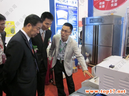 圖為:托普儀器陳渝陽總經(jīng)理為全國農技推廣中心梁志杰、支巨振處長展示儀器設備