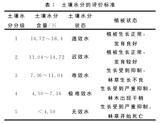 我們現(xiàn)在對土壤水分進行樣品采集和測定主要通過空間代時間的方法來測定不同年限退耕地土壤水分變化。為減少由此產生的誤差,對每個時間序列進行多點重復調查以增加樣本數(shù)。首先通過訪談、歷史資料查證等確定退耕的時間。土壤水分采用土鉆樣,烘干法(105℃)測定,測深5m,取樣深度間隔20cm。采樣時間為2005年7-8月。對獲取資料進行分析時,剔除了由于特殊立地的影響而形成的異常值,用于分析評價的樣點為66個。 評價指標和評價標準根據(jù)所處研究區(qū)域的土壤條件和土壤水分有效性與土壤持水力、水分常數(shù)(主要是凋萎系數(shù)和田間持水量)的特征,劃分出土壤有效水分區(qū)間。一般來說,有效水被植物的利用有難易區(qū)別,愈靠近凋萎系數(shù)的水愈難被植物吸收。在黃土高原,一般以田間持水量的60%作為植被生長阻滯點,相應地,參考有關人員對土壤水分的研究結果,將研究區(qū)土壤含水量劃分為5個等級(表1)。