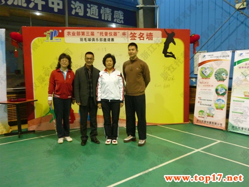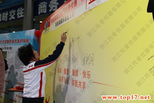 參賽期間,張玉香同志在羽毛球比賽簽名墻上簽名留念,并與全國農技推廣中心杭大鵬書記、贊助商托普儀器陳渝陽總經理等人合影留念。