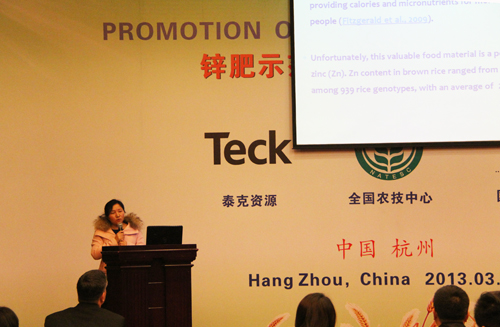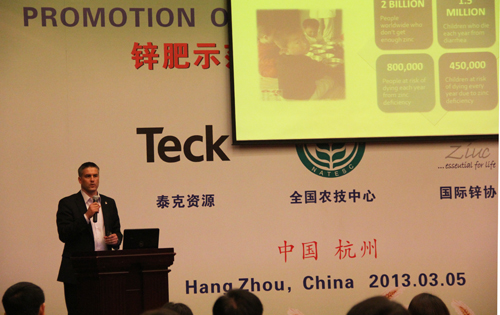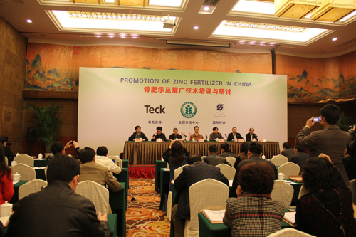 在上午的鋅肥示范推廣技術培訓與研討會上,會議邀請了國際專家加拿大泰克資源安德魯·格林教授、國際鋅協會樊明憲教授、國內專家浙江大學副教授馮英、天津市土壤肥料工作站鄭育鎖科長講解了鋅肥技術以及鋅肥在中國農業生產中試驗示范研究結果。據國際鋅協會報道,全球種植谷物的土地中有50%存在缺鋅的潛在危險、而我國土壤普遍缺鋅。農作物缺鋅主要與干旱缺水、鹽堿、漬澇等農田環境有關,科學施用鋅肥是解決農業缺鋅問題的主要途徑。近年來,隨著節水農業的不斷發展,水肥一體化逐漸成為新的鋅肥科學施用方式。科學施用鋅肥,能夠提高作物產量,改善農產品品質。為促進鋅肥的科學施用,廣泛宣傳鋅對作物生產和人體健康的作用,全國農技推廣中心與國際鋅協會、加拿大泰克資源合作開展鋅肥示范推廣工作,并大力培養應用技術人才、開展田間技術指導。