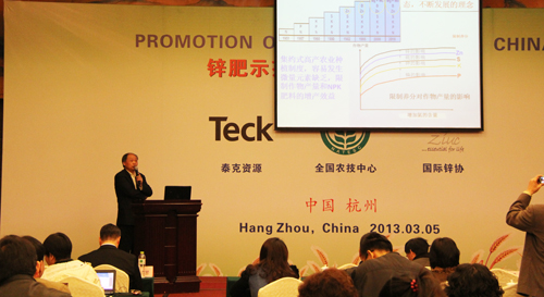 全國農技推廣中心節水處高祥照處長主持會議,全國農技推廣中心杭大鵬書記、浙江省農業廳陳利江副廳長、農業部種植業管理司王金等處長、浙江省農產品質量檢測中心黃國洋主任、加拿大泰克資源安德魯·格林教授、國際鋅協會樊明憲教授出席了會議開幕式并相繼發表了講話。全國農技推廣中心杭大鵬書記對2012年的節水工作所做出的成就表示肯定,并強調,在2013年要繼續強化土壤墑情監測工作,搞好鋅肥示范推廣工作,加大節水工作研究力度。