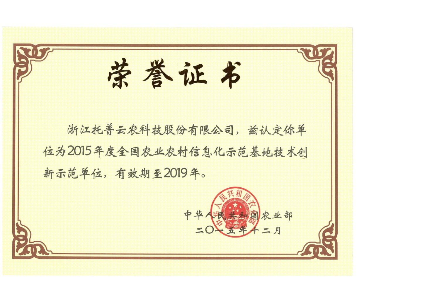 2015年12月9日,農(nóng)業(yè)部發(fā)文公布《農(nóng)業(yè)部關(guān)于認(rèn)定2015年度全國(guó)農(nóng)業(yè)農(nóng)村信息化示范基地的通知》,浙江托普云農(nóng)科技股份有限公司獲批技術(shù)創(chuàng)新型示范單位。《通知》要求各示范基地,秉持創(chuàng)新、協(xié)調(diào)、綠色、開(kāi)放、共享的發(fā)展理念,積極推進(jìn)“互聯(lián)網(wǎng)+”現(xiàn)代農(nóng)業(yè)行動(dòng),大力發(fā)展農(nóng)業(yè),切實(shí)抓好農(nóng)業(yè)電子商務(wù)、農(nóng)業(yè)物聯(lián)網(wǎng)、農(nóng)業(yè)農(nóng)村大數(shù)據(jù)、農(nóng)業(yè)信息服務(wù)等重點(diǎn)工作,大膽探索創(chuàng)新,充分發(fā)揮示范引領(lǐng)作用,為推進(jìn)農(nóng)業(yè)現(xiàn)代化作出新貢獻(xiàn)。